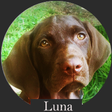 Luna, German Shorthaired Pointer, a Brown Pointer puppy, complemented by a petite white chest patch, emphasizing her solid liver coat, sleek and muscular physique, and elegant appearance. Her docked tail is visible, and her chocolate brown fur has a notable shine. Born April 24, 2025, and is available for rehoming.